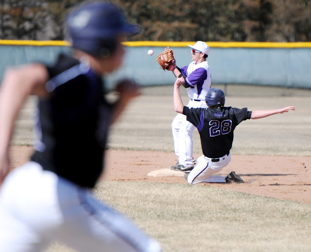 | Sophomore Luke Amsbaugh slides safely into home during a rally midway through the game last Thursday. |