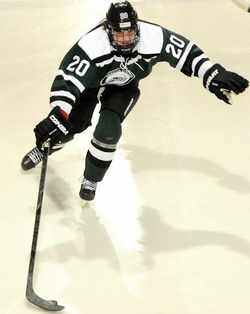 | Junior Noah Grant fires a strong shot at the Devils Lake net in the second period. |